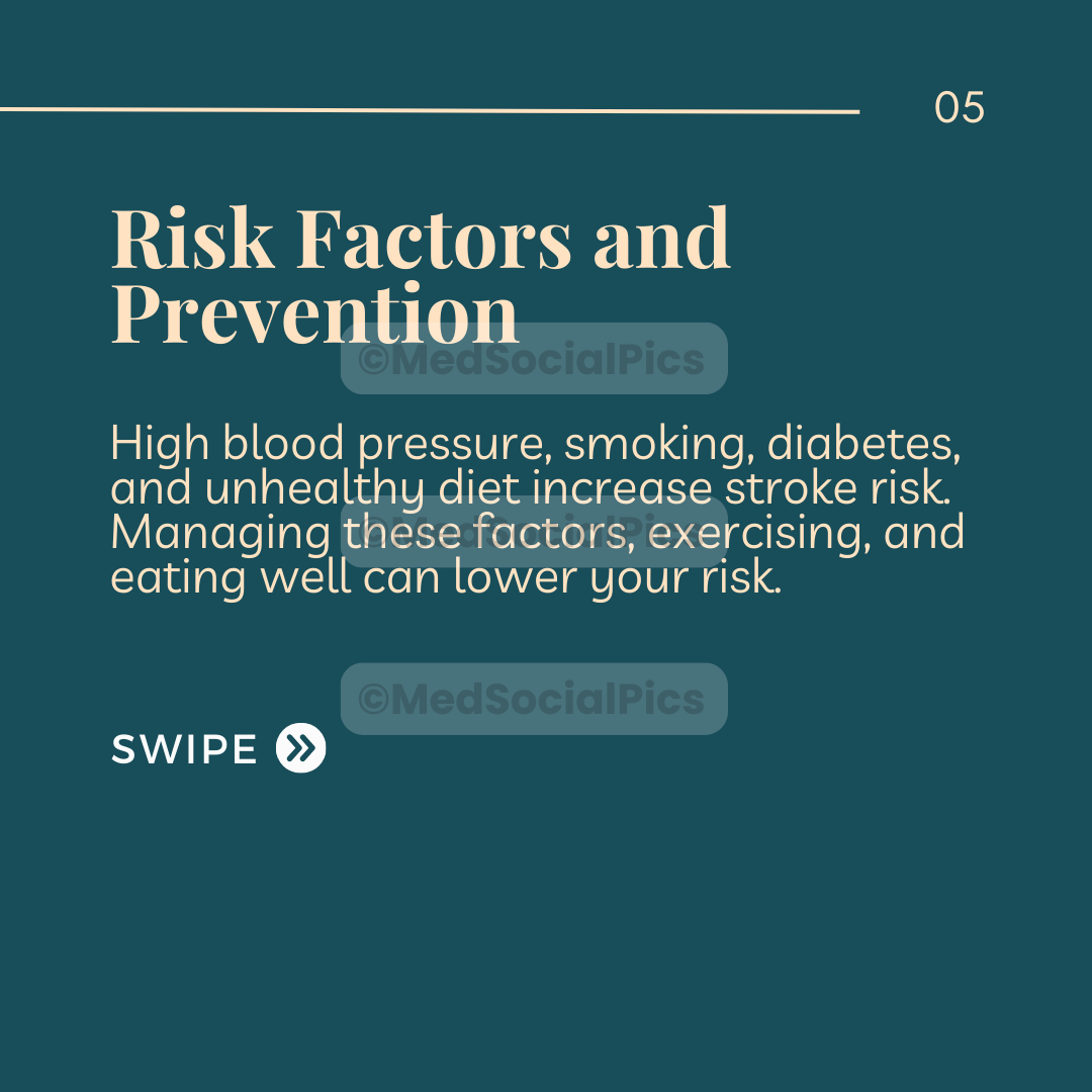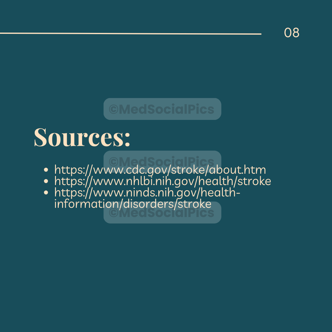 Social media carousel (multiple-image post) template on Stroke. Minimal and clean design. Bite-sized health information with references. Easily educate and engage your followers with information regarding Stroke. Add your logo and branding to make it your own. You can use this post on multiple social media platforms such as Facebook, Instagram, TikTok, etc. Each MedSocialPics carousel (multiple-image post) contains 6 - 10 images.